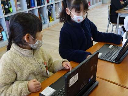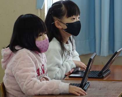 先生の説明を聞いて、パソコンの操作に取り組んでいる様子です。