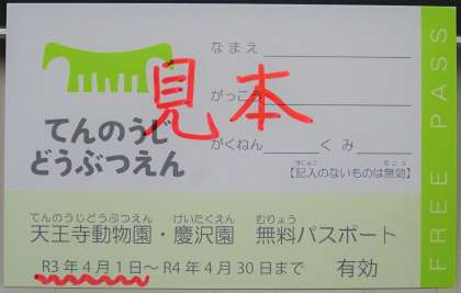 大阪市建設局より、本年4月1日から利用できる「天王寺動物園・慶沢園無料パスポート」が届きました。