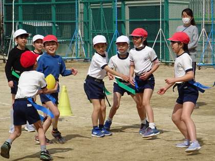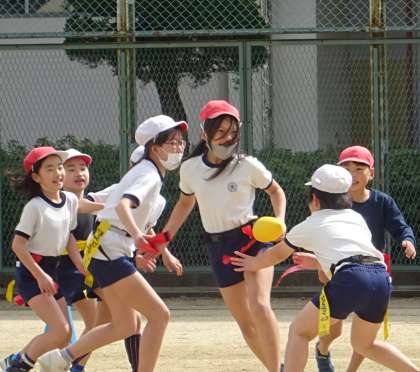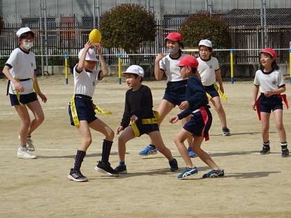 3年生が体育の授業で「タグラグビー」をしている様子です。