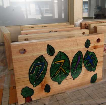 作った樹木プレートを取り付けている様子です。