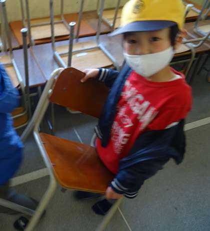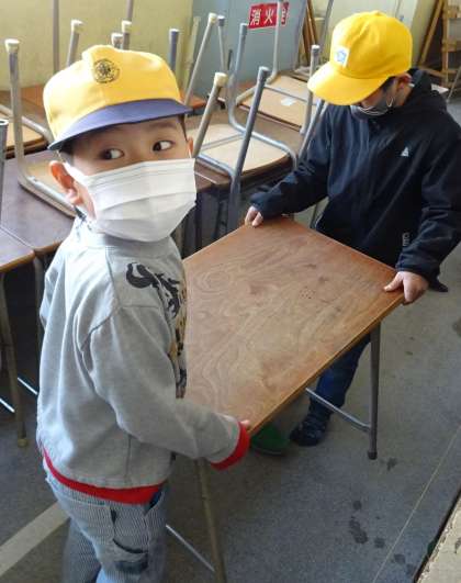 机や椅子を運んでいる様子です。