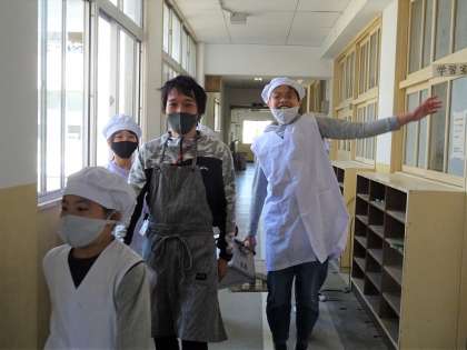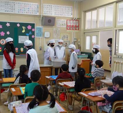 6年生が、1年生の給食を運んできてくれました。