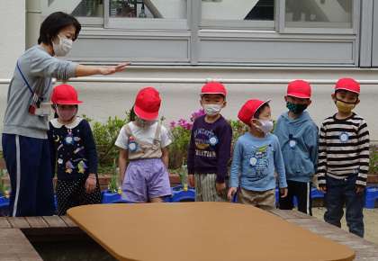 「中庭のテーブルは、座って本を読んだり学習をしたりするところです。他の人の迷惑にならないように、気をつけて過ごしましょう。」