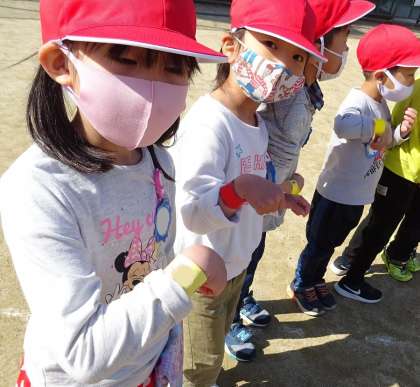 色分けされたうで輪には、ペア(班)の番号が書かれています。