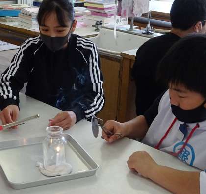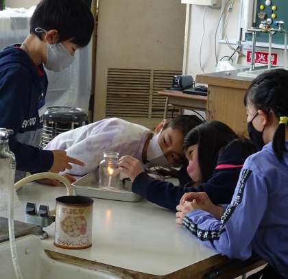 燃え方と空気の関係について、実験で調べている様子です。
