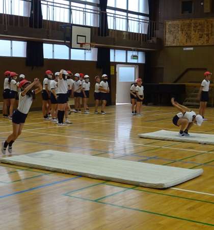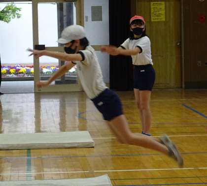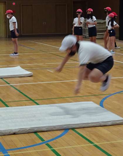 体育の授業で、立ち幅跳びの練習をしている様子です。