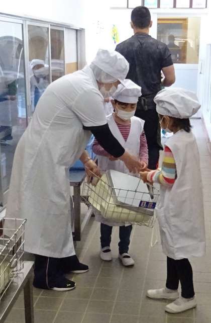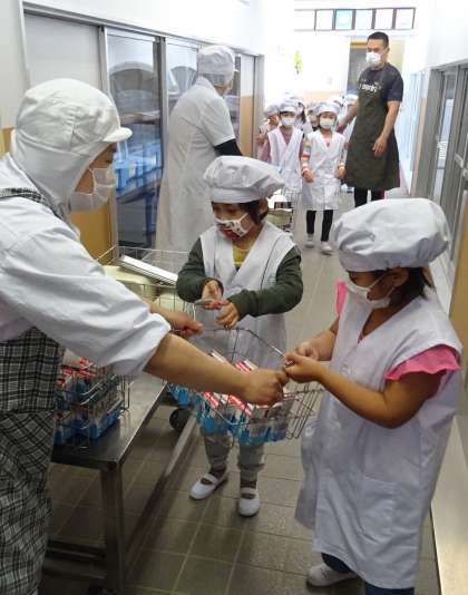 調理員さんから牛乳や食器、ごはんを受け取ります。