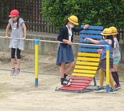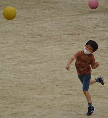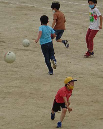 運動場で元気よく遊んでいる様子です。