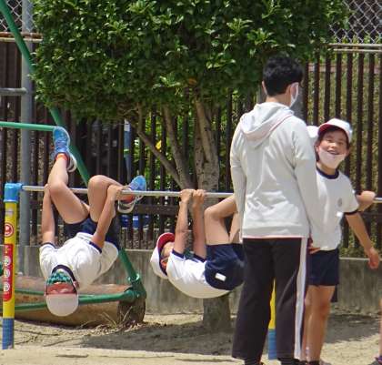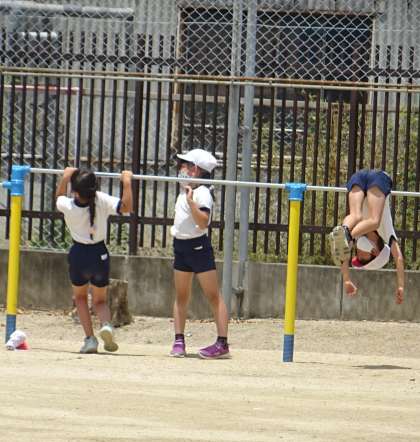 鉄棒で色々な技に挑戦している様子です。