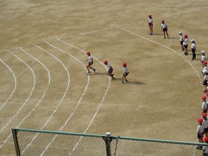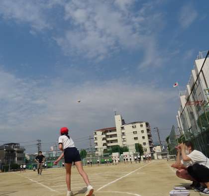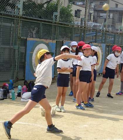 4年生がスポーツテストでソフトボール投げに挑戦している様子です。