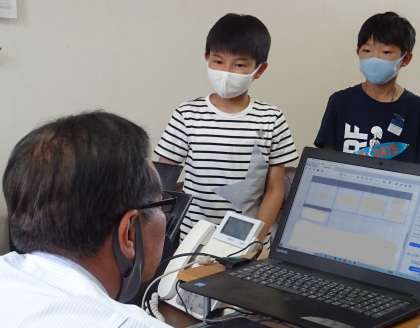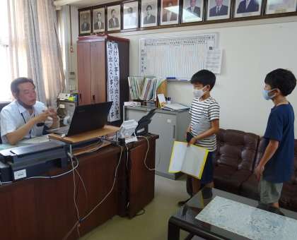 集会委員会の子どもたちが、校長先生にインタビューをしている様子です。