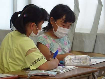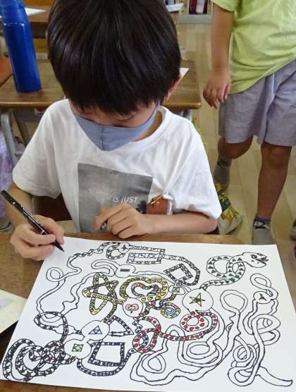 3年生は、図工の授業で「長いヘビ」を描いています。