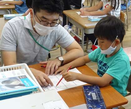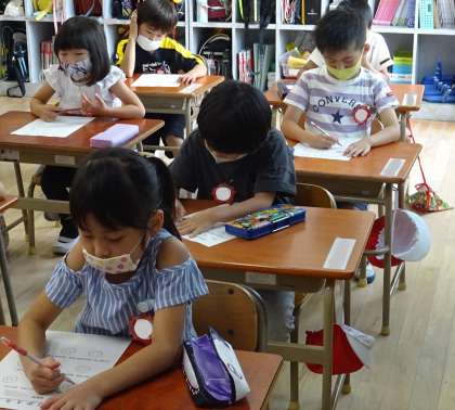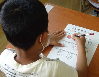 授業を振り返り、ワークシートに色塗りをしている様子です。