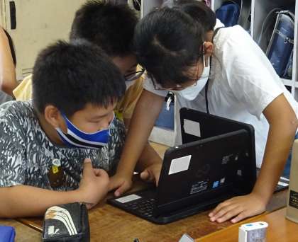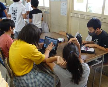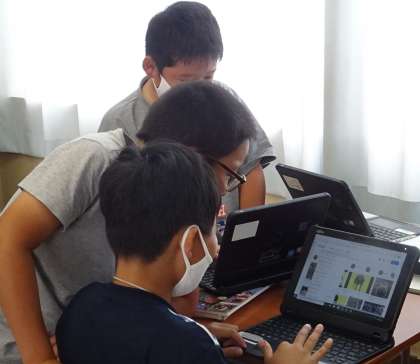 プレゼンテーションソフト「パワーポイント」を使って、各班が発表の練習をしています。