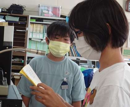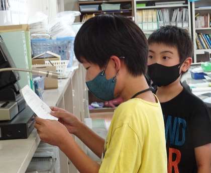 保健美化委員会の子どもたちが、放送でメッセージを伝えている様子です。