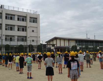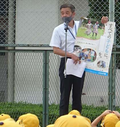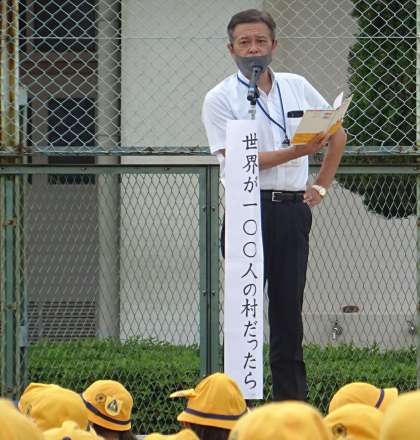 児童朝会で校長先生からは、「世界がもし100人の村だったら」という本が紹介され、争いなどの危険な中で満足な食べ物もなく生活している人が多くいることや、毎日学校で友だちと勉強ができたり安全な水が飲めたりすることの幸せを知り、世界が平和で人々が幸せであるために、一人ひとりが今できることを考えてほしいという話がありました。