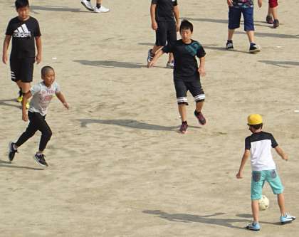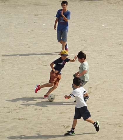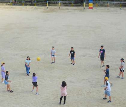 梅雨の晴れ間に、運動場で元気よく遊ぶ子どもたちの様子です。