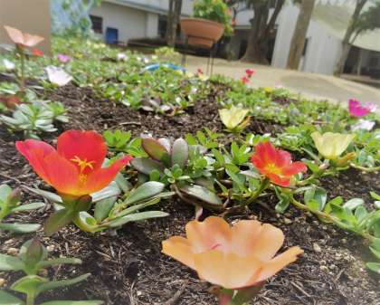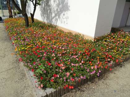 別名「ハナスベリヒユ」という花で、暑さや乾燥にも非常に強いので、夏休み中に水やりをしなくてもキレイな花が次々と咲いています。