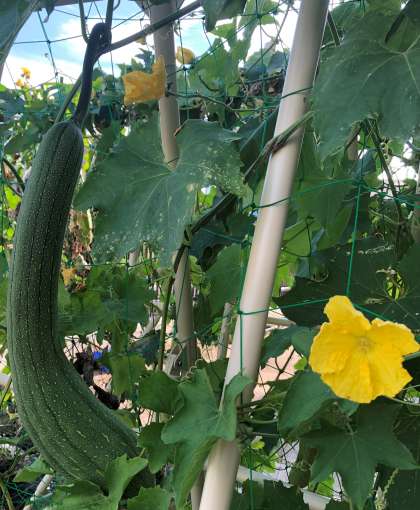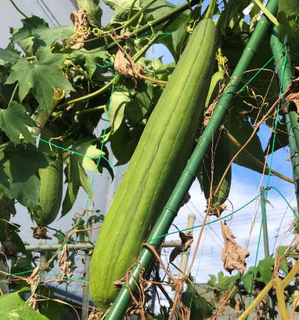 夏休み中の学習園では、ヒョウタンやヘチマの実が大きくなっています。