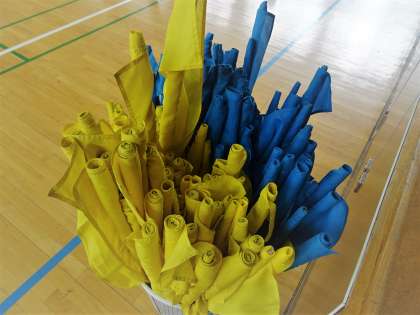 5・6年生が講堂でフラッグの練習をしている様子です。