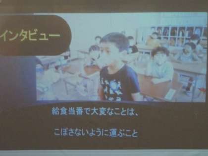 5年生が取材し編集した、各学年の紹介ビデオ動画を視聴している様子です。