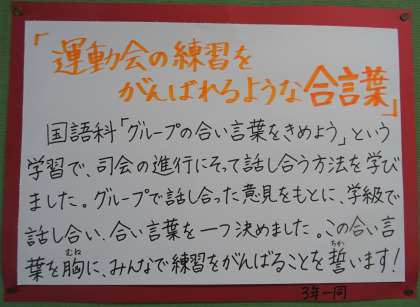 3年生が国語の授業で話し合った「練習をがんばれるれ合言葉」です。