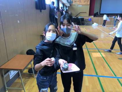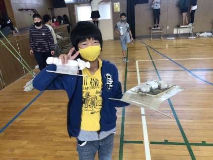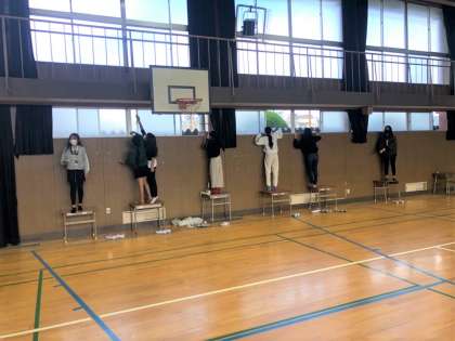 6年生は、家庭科の授業で作ったアイデア便利おそうじグッズを使って、講堂を掃除しました。
