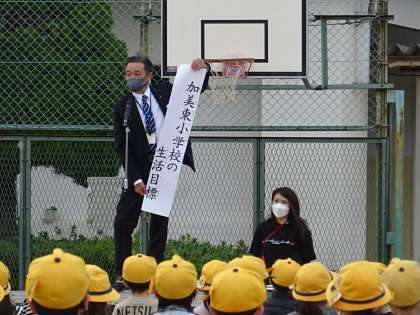 朝会では、校長先生から加美東小学校の生活目標についての話がありました。