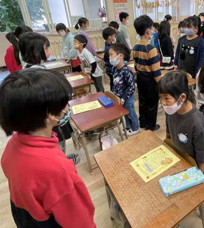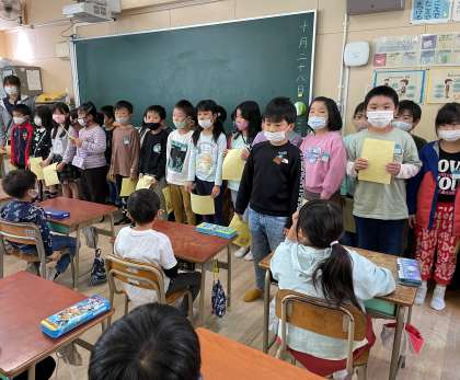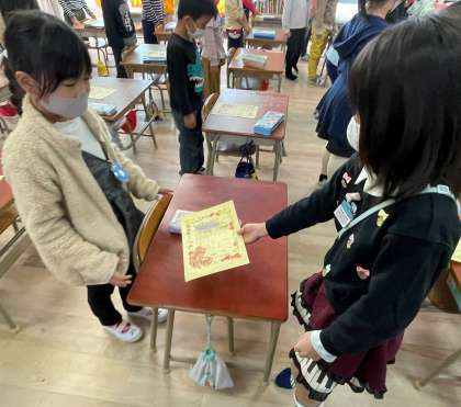 2年生が1年生に「おもちゃランド」への招待状を渡している様子です。