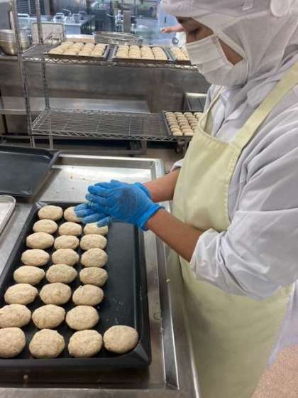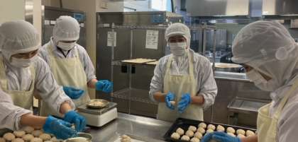 給食室では調理員さんが、子どもたちの喜ぶ笑顔を思い浮かべながら、1こずつ真心を込めて作っていきます。
