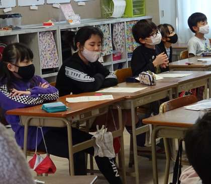 木曜日の児童集会では、運動場いっぱいに広がって「めんえきアップ体操」を行いました。