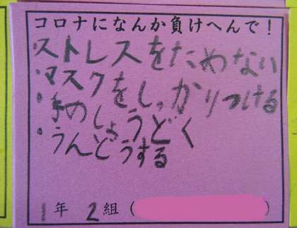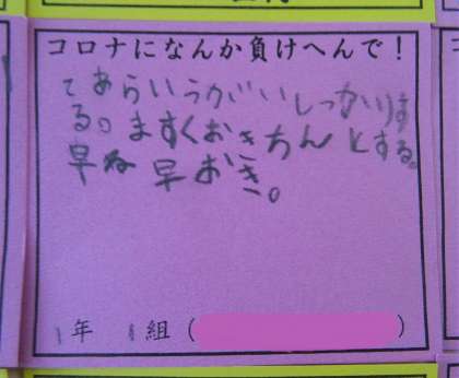 1月24日からスタートした「健康チェック週間」「給食週間」「かけあし週間」に合わせて、規則正しい生活や体力増進、バランスの良い栄養(給食への感謝)など、免疫をアップすることで、コロナに負けない健康な体づくりに取り組んでいます。