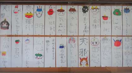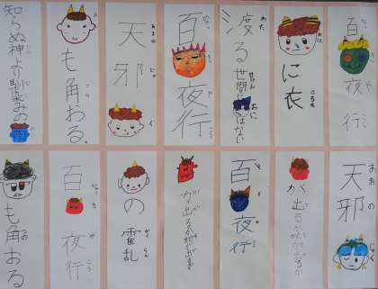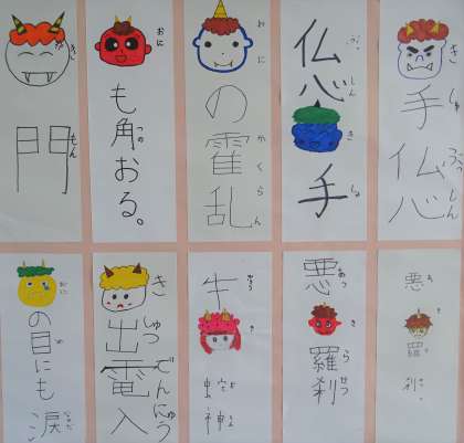 「鬼」がつく熟語やことわざを調べ、鬼の絵も描いて掲示しています。