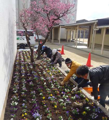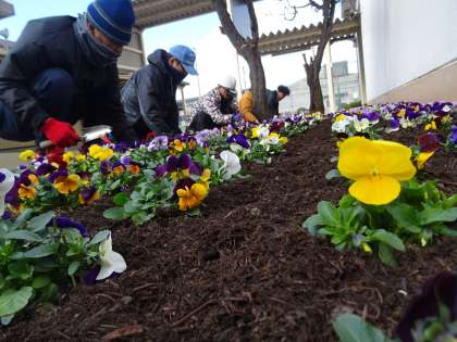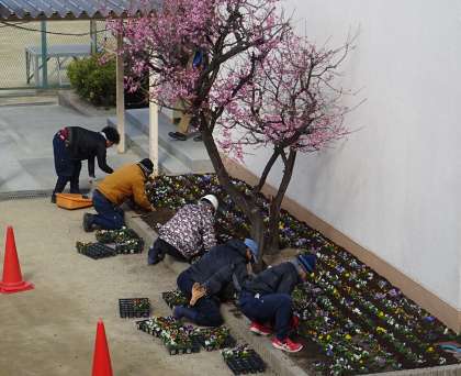 講堂前の花壇に、色とりどりのビオラの花が植えられました。