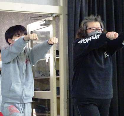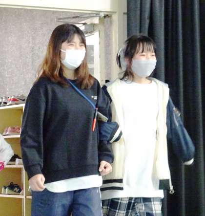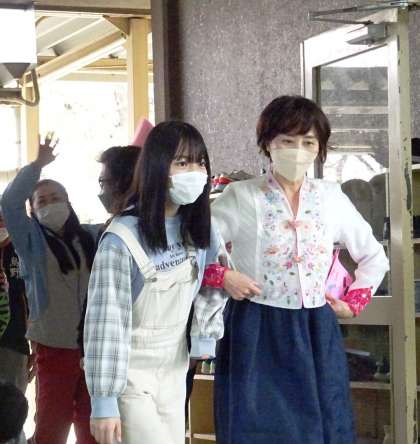 教職員や学校関係スタッフと一緒に、いろいろなポーズをしながら入場します。