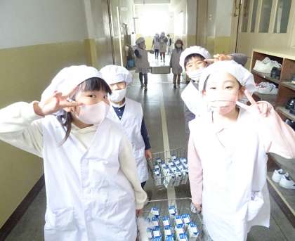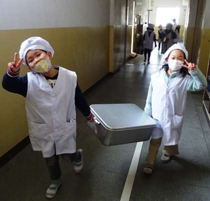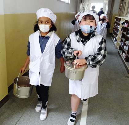 給食当番の役割も安心して任せられるようになった1年生。