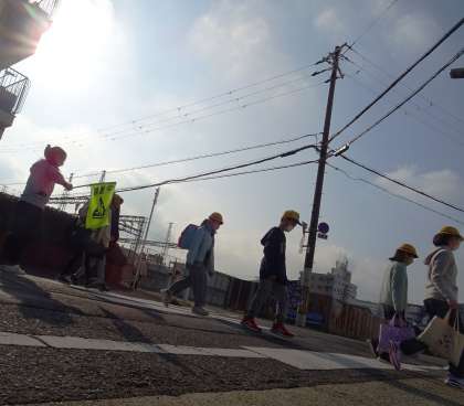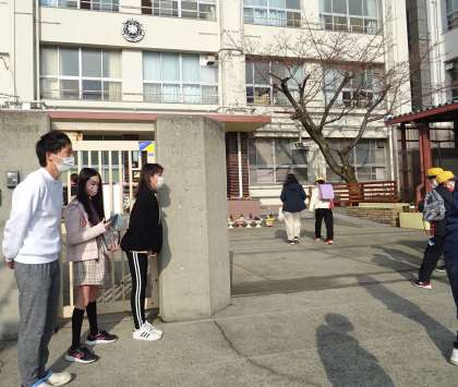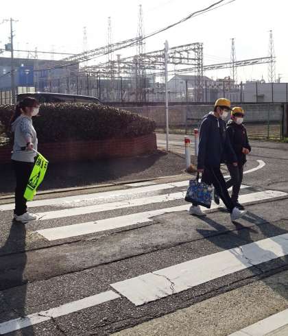 卒業生が校門に立って、あいさつ運動をしてくれました。