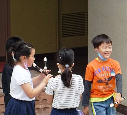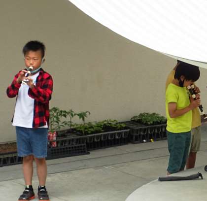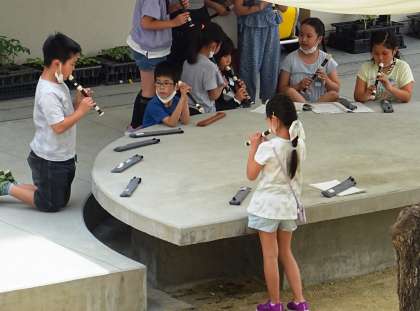 3年生が中庭でリコーダーの練習をしている様子です。
