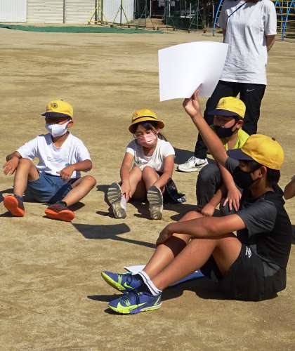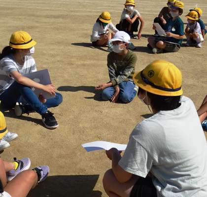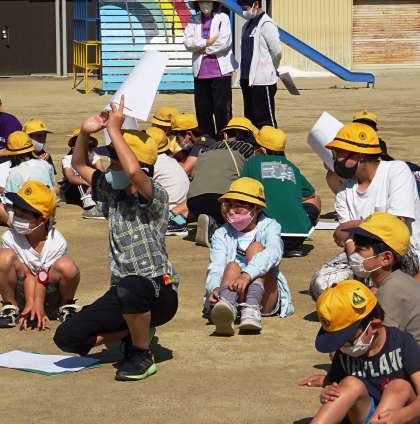 たてわり班で協力してクイズに挑戦している様子です。