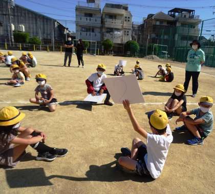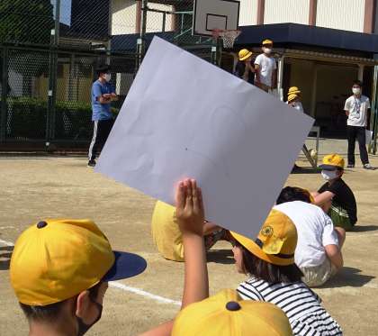 たてわり班で協力してクイズに挑戦している様子です。