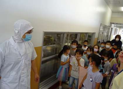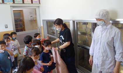先日、給食室を見学させてもらった1年生の子どもたち。