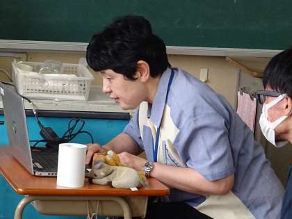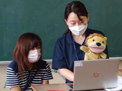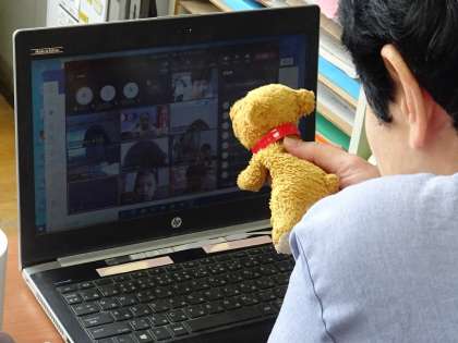 自宅からオンラインで学校(教室)にいる先生と通信している様子です。