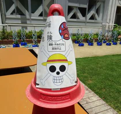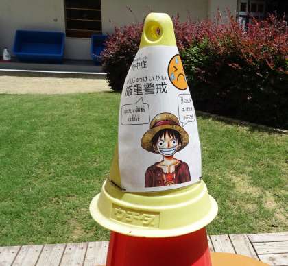 注意情報が出ると、中庭のテーブルにコーンを立てて合図します。