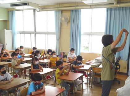 カッターの使い方について、先生の説明を聞いている様子です。