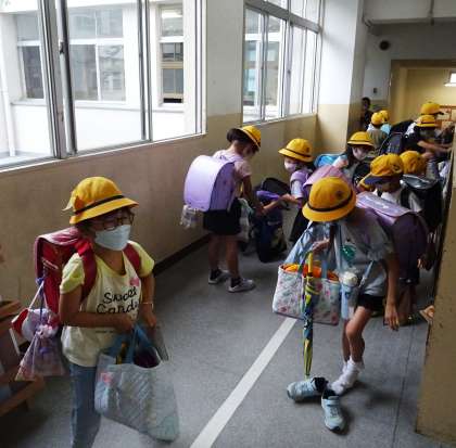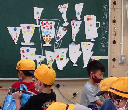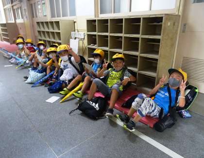 いきいき活動に参加する子どもたちは、1組・2組そろって出発します。