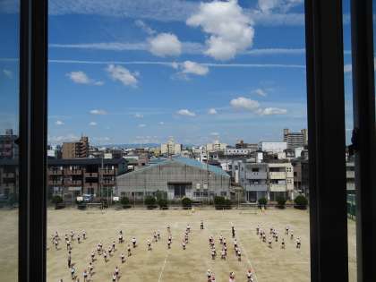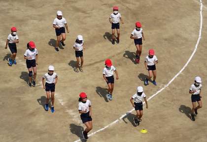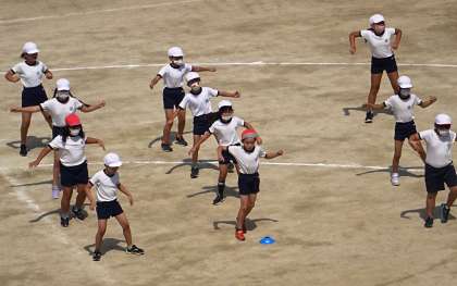 運動場でダンスの振りを練習している様子です。