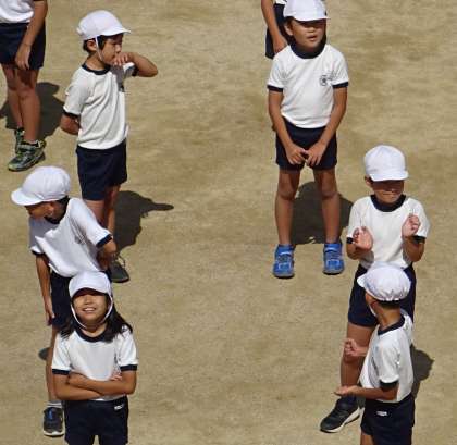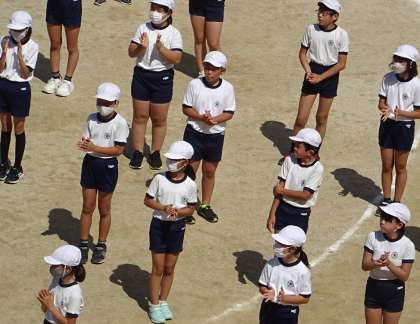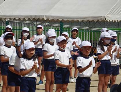 優勝した赤組の健闘を称え、拍手を送る白組の子どもたち。