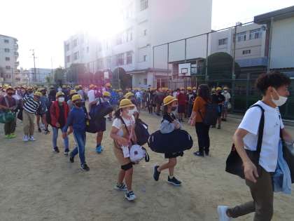 見送りに来てくれた家族や教職員の皆さんに、元気よくあいさつして出発しましょう。