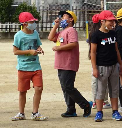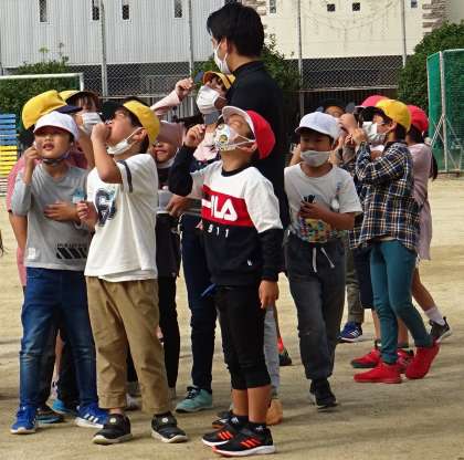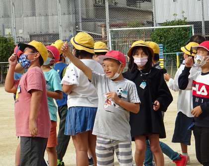 遮光板を使って太陽🌞を観察している様子です。