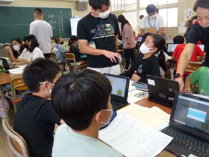 子どもたちは、タブレット端末を使って自分の意見を書き込んでいきます。